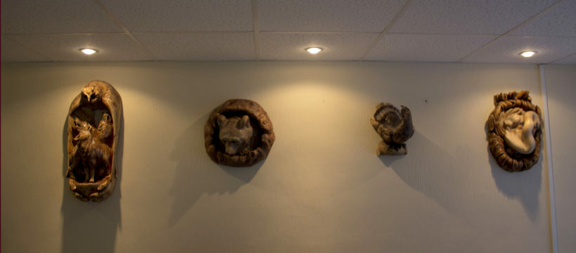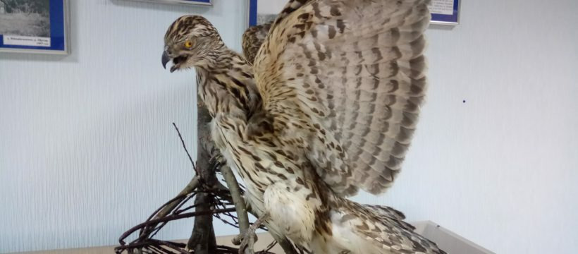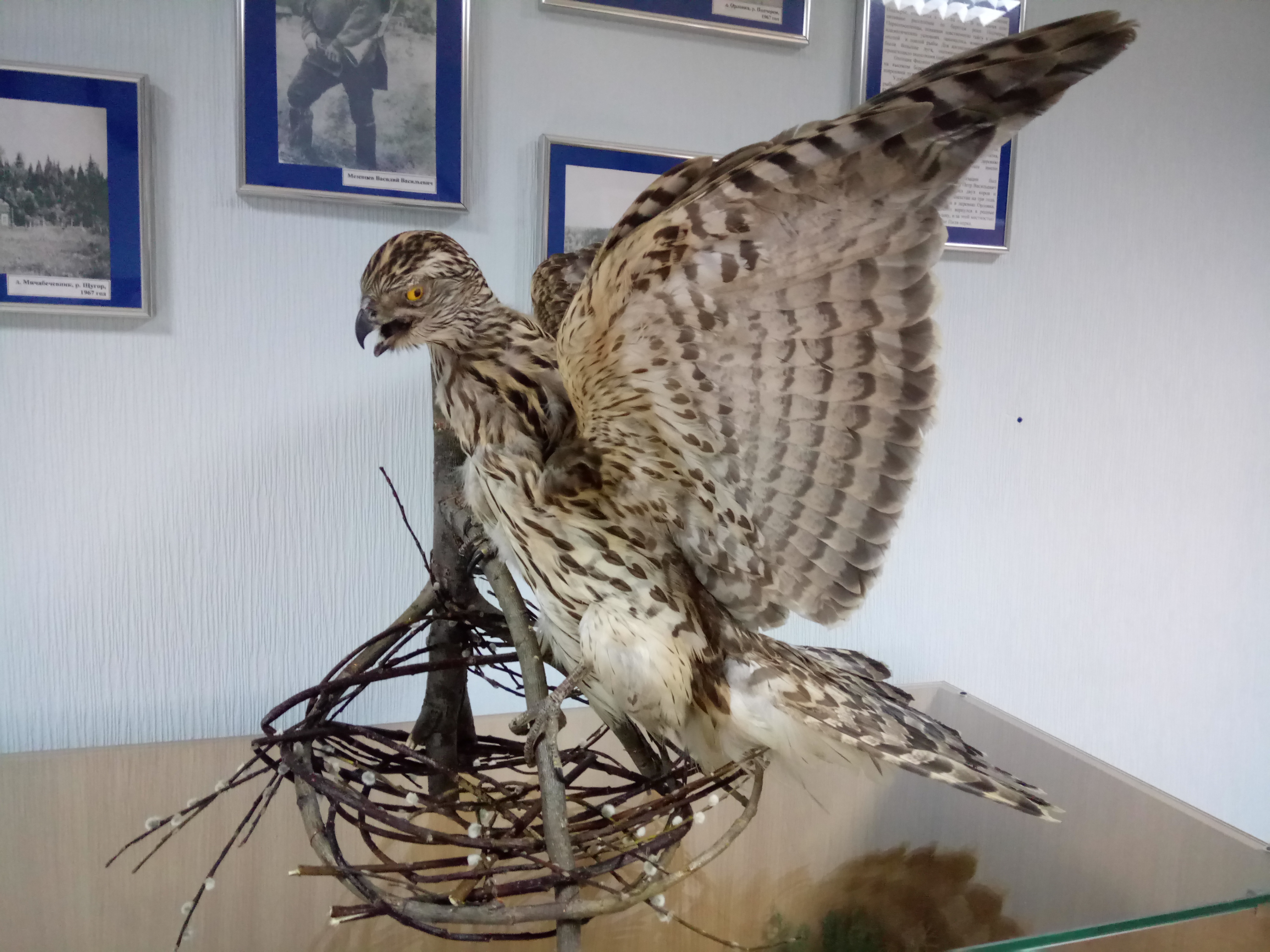 Юрий Петрович уже не первый год создает экспонаты для нашего музея. Идеи для своих работ мастер находит в образах природы. Стены музея украшены его предыдущими изделиями: волки, медведица, глухарь, лебедь, сова с горностаем. Недавно Иван Петрович изготовил чучело ястреба. История хищной птицы трагична — он погиб, ударившись о провода ЛЭП. Во время одной из прогулок школьники нашли погибшего ястреба и принесли в парк, мы передали птицу мастеру. Тот изготовил чучело и принес в качестве экспоната в наш музей.