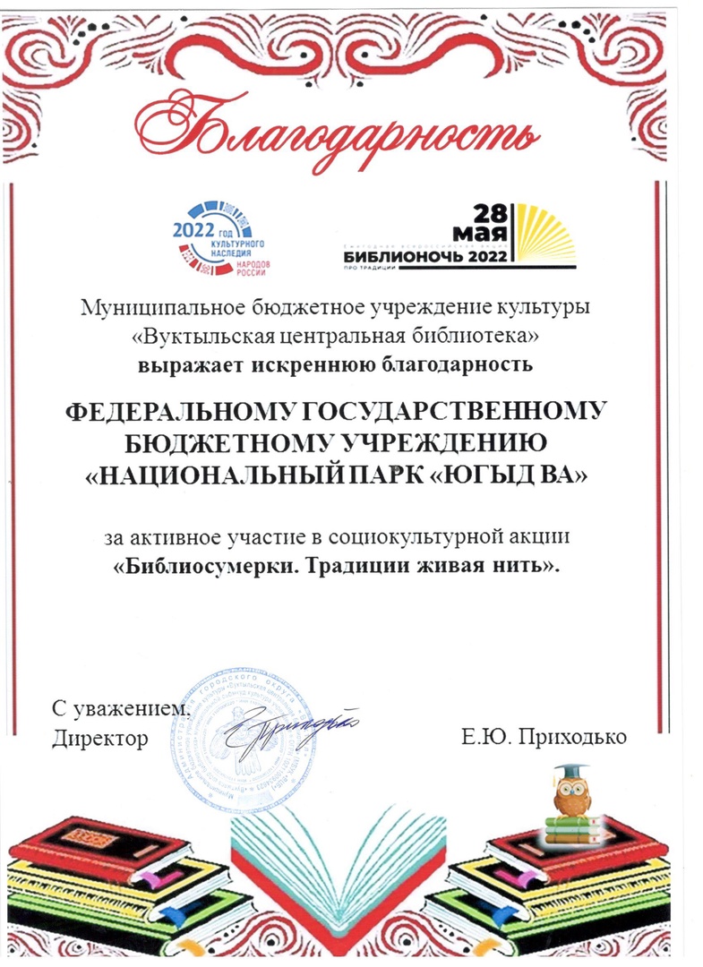 2022 год объявлен Годом народного искусства и нематериального культурного наследия народов России. 20 мая 2022г на базе МБУК «Вуктыльская центральная библиотека» г.Вуктыл сотрудники национального парка «Югыд ва» приняли участие в социокультурной акции «Библиосумерки. Традиции живая нить».