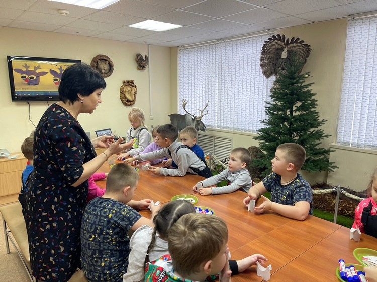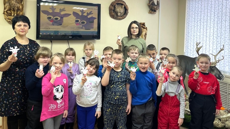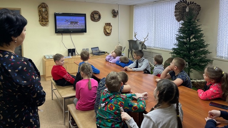 После обзорной экскурсии по музею, для дошкольников был проведен экологический урок, на котором ребята узнали сколько видов оленей существует, как они приспособлены выживать в северных условиях, кто является врагами оленей, чем они питаются, и как олень помогает человеку. Вместе с сотрудниками парка посмотрели видеосюжет «Интересные факты про оленя» и поиграли в подвижную игру под музыку «У оленя дом большой».