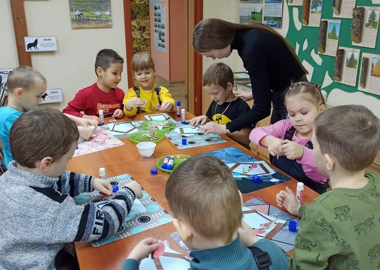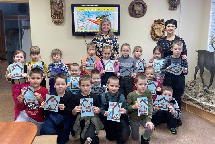 Посмотрели мультфильм Фиксики «Кормушка», провели несколько дидактических игр «Какая птичка улетела?», «Угадай птицу по описанию», «Узнай птичку по силуэту». В завершении экологического урока специалисты парка провели мастер-класс «Птичья столовая» с дошкольниками. Из полосок разной ширины на листе бумаги у дошколят получилась кормушка и на неё сразу «прилетели» разные птицы: у кого-то воробьи, у кого-то снегири и синицы. Ребята «накормили» зимующих птах разными видами корма (семечками, салом и т.д.).