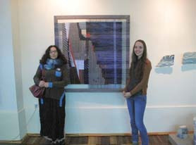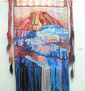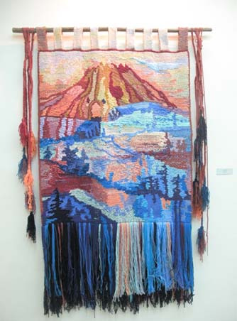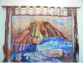 Две работы выставки были посвящены теме гор, Урала. Весной, когда дипломники выбирали темы работ, зам. директора парка Елена Шубницина специально проводила встречу-лекцию, где рассказывала о природе и культуре Урала, его мифах и легендах, красотах и тайнах. Услышанное, увиденное и представленное воплотилось на выставке в двух больших гобеленах: «Манарага» Дины Козловой и «Путники»Анастасии Белолипецких. На первом легендарная гора — визитная карточка Национального парка — предстает в виде того самого медведя. Плавный переход красно-золотых тонов с закатных отсветов на горе в их отражение в водах у подножия, синеющих внизу и переходящих в синеющий лес — все это навеяно северной тематикой.