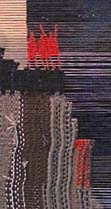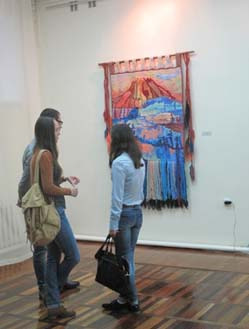 Вторая работа — гобелен в смешанной технике: серо-коричневые горы, синеватые дали на горизонте — и ярко-красные человечки, храбро карабкающиеся вверх.Выставка продлится больше месяца — до середины ноября.