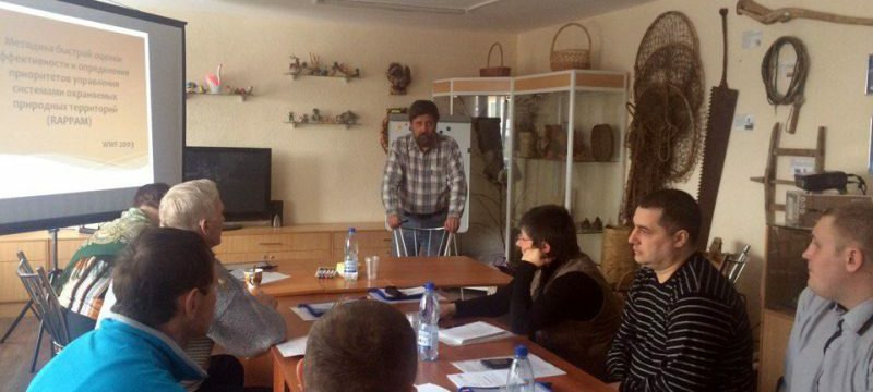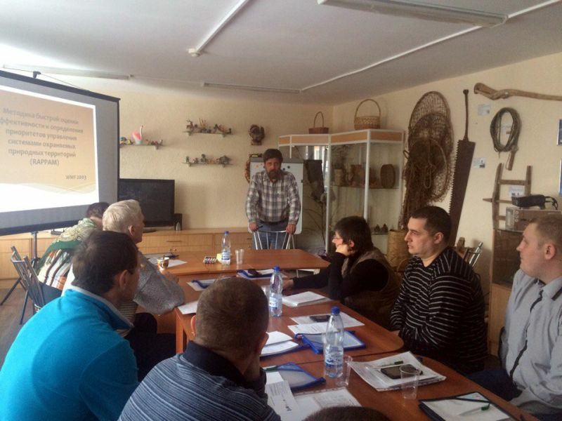 Т.Ю. Минаева (консультант проекта, старший научный сотрудник Центра сохранения и восстановления болотных экосистем института лесоведения РАН г. Москва) рассказала об особенностях ключевых экосистем в зоне распространения мерзлоты. Представлен очень познавательный фильм «Многолетняя мерзлота». Сохранение этих экосистем и грамотное управление ими является основным направлением национальных действий по смягчению изменений климата и адаптации к ним. Оценка эффективности управления ООПТ для целей сохранения климата является важной составляющей национальной отчётности Рамочной конвенции ООН об изменении климата. Именно поэтому для проведения оценки эффективности национального парка «Югыд ва» был приглашен М.С. Стишов (координатор проектов по сохранению биоразнообразия Российской национальной организации Всемирного фонда дикой природы, кандидат биологических наук), который является признанным специалистом в области оценки эффективности ООПТ. Им были представлены три методики оценки эффективности ООПТ (RAPPAM, BAT и МОПЭ). Он объяснил какие модификации были внесены в методики для учета роли ООПТ именно для сохранения климата, а также подробно рассказал как работает методика. Согласно методики семинар является составной частью оценки эффективности ООПТ. Оценку проводят не специалисты в своих кабинетах, а все сотрудники парка коллективно, давая балльную оценку тому или иному параметру. Михаил провел коллективную работу по заполнению анкетных форм и таблиц и анализу результатов совместно с сотрудниками парка. Главным фактором успешной работы стал высокий уровень заинтересованности сотрудников, активное их участие, полное понимание содержательной части работы и, конечно, представленность всех подразделений и филиалов национального парка.