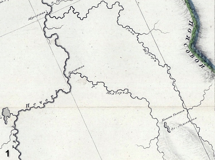 • 4 Фрагмент карты Крузенштерна, Подчерье на левом берегу Печоры, горы Тельпос-из и Тима-из крайне далеко от реального расположения.