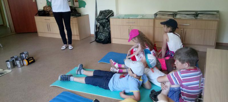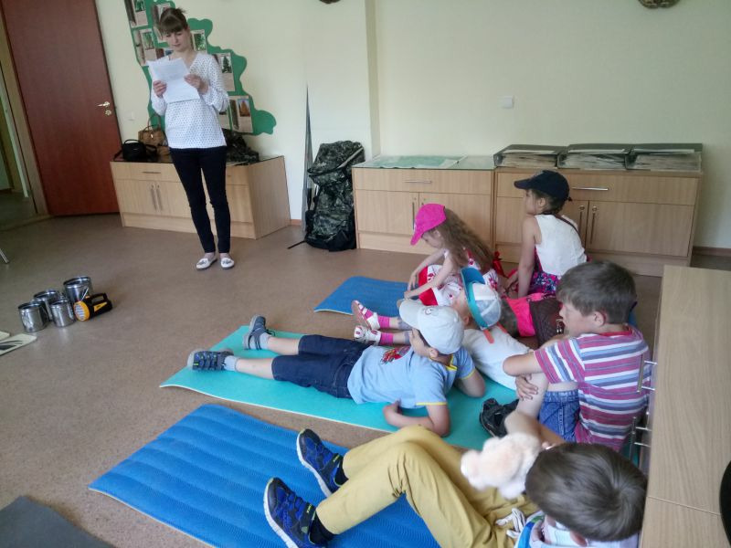 Ребята поговорили о туристическом походе и что необходимо брать с собой. Дети лежали на туристических ковриках, укрывались спальным мешком. Все вместе отгадывали загадки про туризм, решили популярную туристическую задачу, произнесли клятву туриста с обещание помогать друг другу в походе, соблюдать правила пожарной безопасности и беречь природу.
