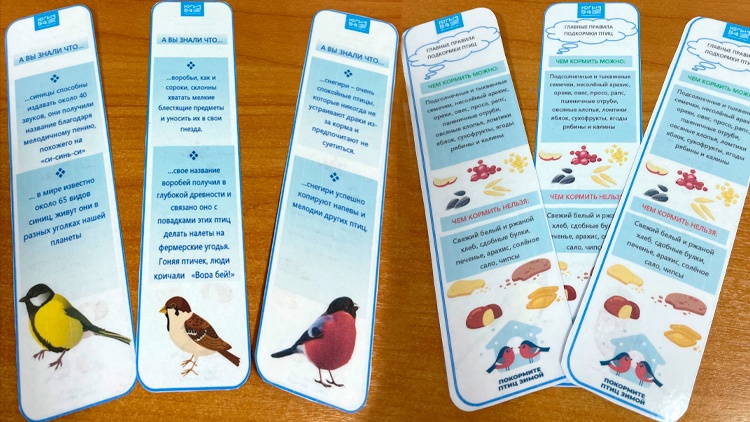 Татьяна Подберезная, специалист по экологическому просвещению, рассказала школьникам об акции, которая стала доброй традицией напоминать о необходимости подкармливать птичек до весны. На закладках размещена информация о том, чем можно подкармливать, а чем нельзя. На другой стороне закладки –интересные факты о пернатых. Закладка станет напоминанием о необходимости подкормить птичек в трудное для них время.
