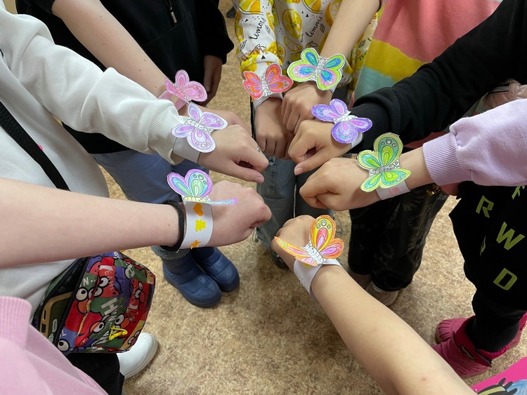 Далее все вместе приступили к мастер-классу. На этот раз сотрудники парка предложили ребятам на выбор два мастер-класса «Пчелки» или «Браслет-бабочка». Интересы разделились, и работа закипела. Часть ребят вырезала по шаблону «браслет», затем кто-то разукрашивал его карандашами, а кто-то украшал сердечками или цветочками. Браслеты примерили на руку и сделали оригинальные фото. Некоторые участники мероприятия предпочли сделать аппликацию «Пчелка».