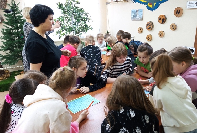 Сначала школьники ознакомились с рисунками выставки «Будь природе другом!», в музее они заинтересовались доисторическими окаменелостями, измерили свой рост у ростомера «Животных», рассмотрели птиц и рыб, угадали следы животных и заглянули в зал «Старины и быта».