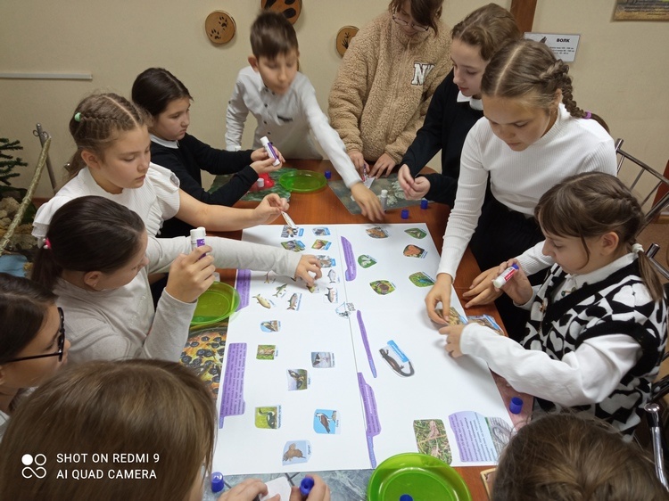 После беседы ребята отвечали на вопросы по теме урока, и все отвечали правильно потому что слушали внимательно и не отвлекались. Следующим этапом мероприятия стало создание коллажа. Одна команда оформляла плакат с флорой и фауной национального парка «Югыд ва», а вторая с вершинами и реками парка. Эти коллажи школьники забрали с собой, для того чтобы повесить в классе и постепенно запоминать названия гор, рек и озер, животных и растений парка.