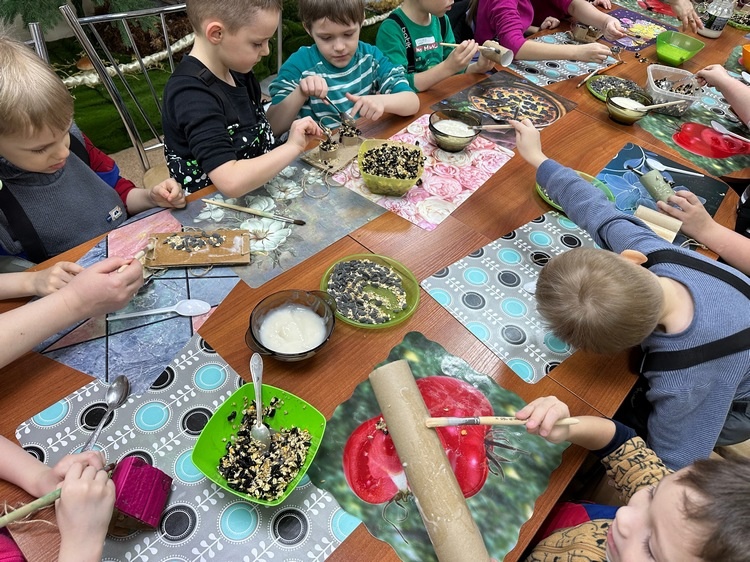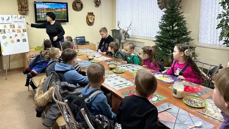 Ребят познакомили с выставкой фотографий, посвящённой зимующим птицам Республики Коми. Напомнили дошкольникам, как и чем можно и нужно подкармливать птиц в холодное время года, а затем сотрудники парка провели для ребят мастер-класс по созданию съедобной кормушки для зимующих птиц. Пока съедобные кормушки затвердевали, с детьми провели интерактивную игру «Птицы».