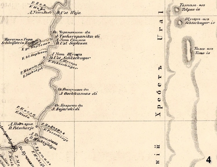 • 4 Фрагмент карты Крузенштерна, Подчерье на левом берегу Печоры, горы Тельпос-из и Тима-из крайне далеко от реального расположения.