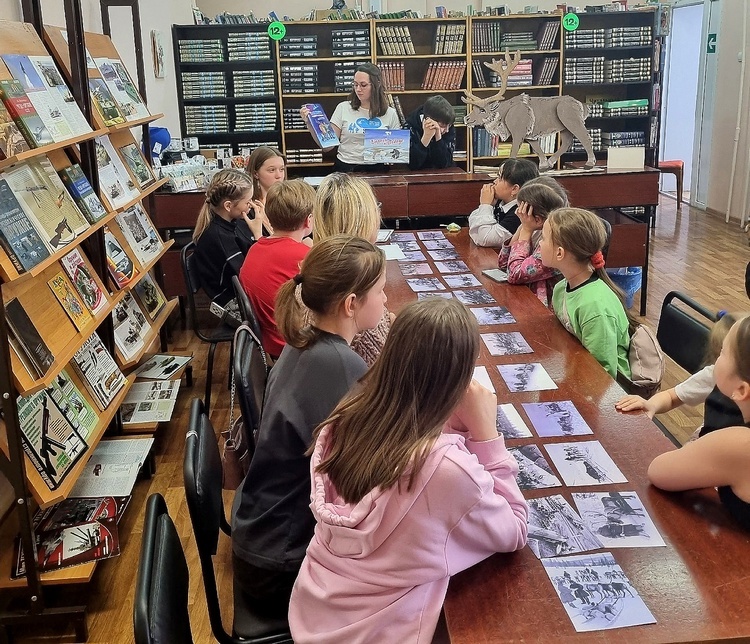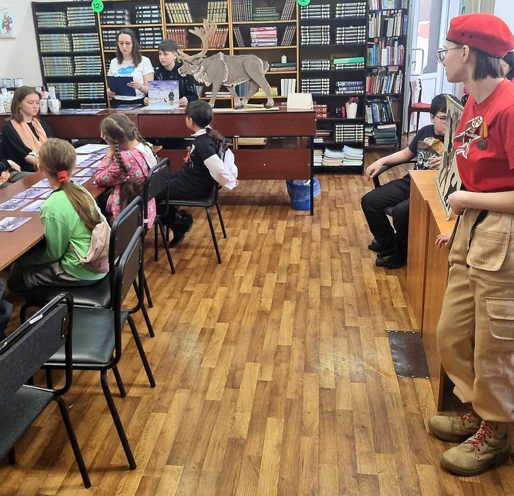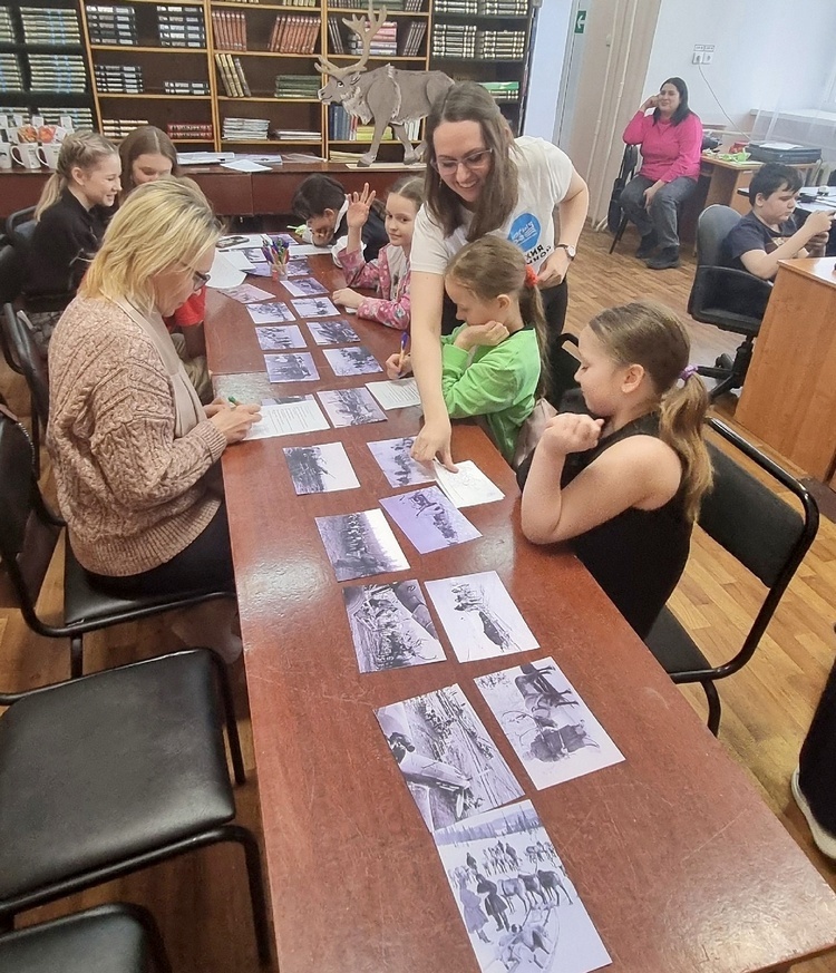 Встретив своих гостей на одной из площадок, Елизавета Чумак провела тематическое мероприятие «Олени и оленеводы в годы Великой Отечественной войны». Презентовав книгу «Дорога к Победе» и альбом-раскраску «Как олени родину защищали», она рассказала об истории подвига оленеводов и их боевых товарищей – оленей. Участники мероприятия с интересом рассматривали фотографии военных лет, взятые из интернета. Многие из присутствовавших отметили, что впервые услышали о том, что оленно-транспортные батальоны принимали участие в Великой Отечественной войне. Помимо просветительской деятельности Елизавета Чумак предложила участникам мероприятия выполнить ряд заданий: помочь оленеводу распутать аркан, найти пару одинаковых оленей и рогов, разгадать ребус и кроссворд, соотнести названия лакомств оленей с картинками и многое другое.